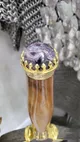 Каждый элемент доспеха изготовлен из благородных материалов и выполнен с максимальной тщательностью. Шлем, выполненный из сплава, украшен сложной резьбой, покрыт никелем и золотом высшей пробы (толщина 10 мкм), что придает ему неповторимый блеск. Меч, созданный из дамасской стали и украшенный натуральным камнем чароит, является символом мастерства и власти.
